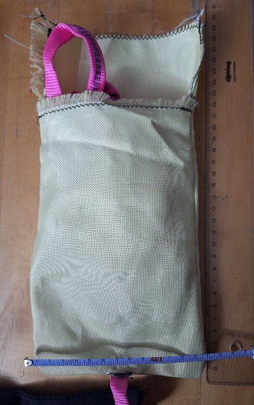 Ich könnte als Reserve ja mal meinen 4 Zoll Kevlarbeutel mitbringen, ganz einfach genäht, selbst ohne Schlaufe, weil es durch ein innenliegendes Kettenglied "nach unten" gehalten wird. Besser als nix!