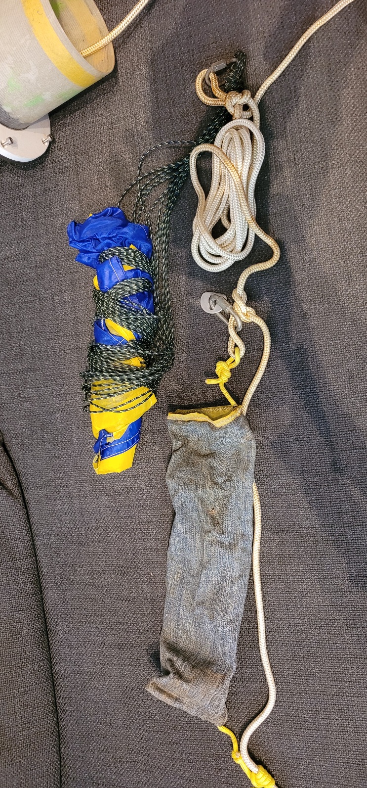 Zum Sack: so wie das Setup mit dem Pyro Release ist, ist es empfehlenswert, den Sack am offenen Ende am Pyrorelease aufzuhängen. Andernfalls wird der Fallschirm beim Start aus dem Sack rutschen und zumindest teilweise mit dem Vorschirm herauskommen. Ich habe bei meinem Fallschirmsack ein durchgehendes Seil (gelb) entlang einer Seite eingenäht. So kann ich den an der Schockleine parallel fixieren (damit der Schirm gerade herausgezogen wird) und ihn auf der offenen Seite an der Lasche vom Pyrorelease anknoten: