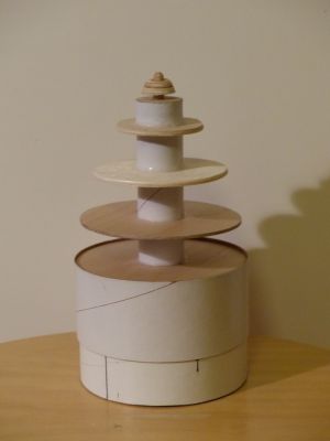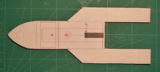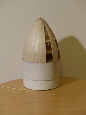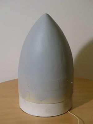 Hallo, ich möchte jetzt mal das Raumschiff Friede von Hermann Oberth aus dem Film "Die Frau im Mond" bauen. Es dürfte hinlänglich bekannt sein. Im Netz findet man eine Zeichnung mit den Maßen, die wohl ursprünglich von Peter Alway stammt. Wenn die Maßangaben in Meter sind, soll das Modell im Maßstab 1 : 100 realisiert werden, was die Sache einfach macht, da man statt Meter einfach Zentimeter nehmen kann. Es soll von einem Cluster von Klima-Motoren angetrieben werden. In ein Körperrohr wird daher ein 50 mm Rohr eingeklebt, von zwei Ringspanten gehalten: Mit der Spitze geht das nicht so einfach. Es fand sich nichts Vernünftiges - wie etwa eine PET-Flasche in dieser Größe und ähnlicher Form -, was sich als Grundkonstruktion eignete. Nun würden wohl die meisten eine entsprechende Form bauen und ein Negativ-Modell erstellen, aber dafür fehlt mir die Erfahrung. Ich habe mich daher entschlossen, entsprechende Ringspanten auf ein Körperrohr zu kleben und das dann zu "beplanken". So geht es also los: Darauf habe ich dann Balsaholzstreifen der Stärke 1,5 mm geklebt, die einseitig mit Glasfaser laminiert waren: Nach mehreren Runden Spachteln - zunächst mit PUR Spachtel von Henkel, später mit Spritzspachtel - und Schleifen sieht es schon ganz manierlich aus: Nun denkt man, dass durch die weit nach hinten gezogenen Flossen der Druckschwerpunkt weit genug vorn liegt, aber die Überraschung kam, als ich das mit OpenRocket simulierte. Ich habe daher die Form auf Pappe geklebt und ausgeschnitten, um die Lage des Schwerpunkts zum Vergleich empirisch zu ermitteln: