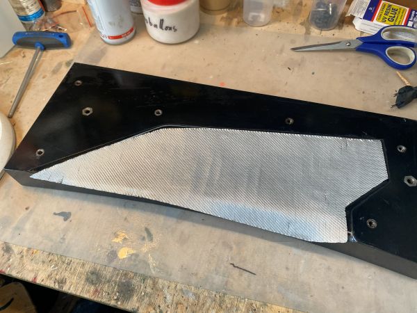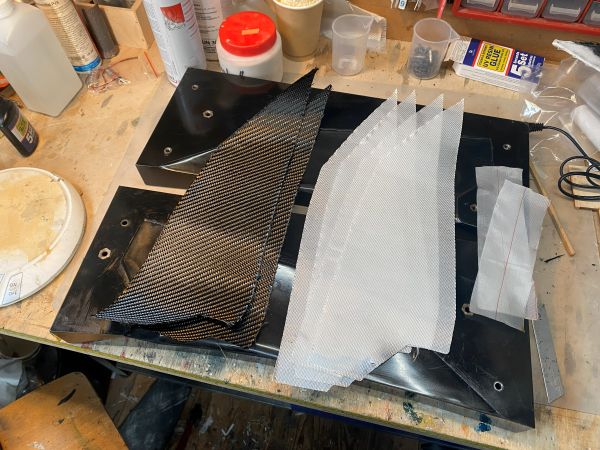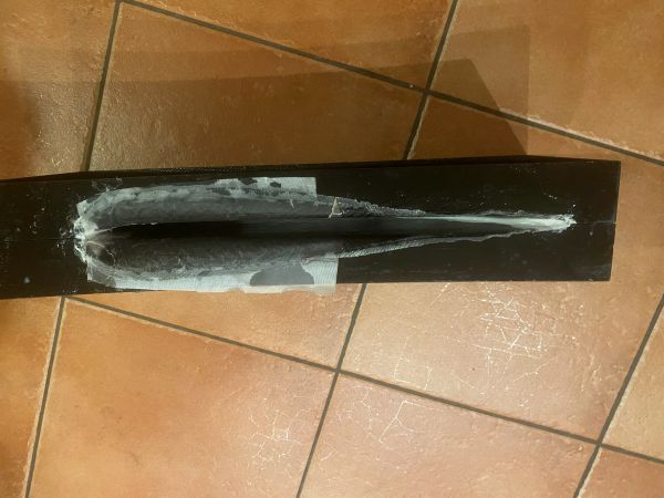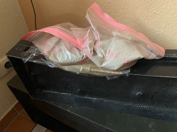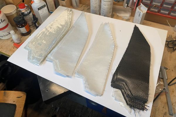 Die Formen werden genauso vorbehandelt wie schon bei der Spitze, nur der Laminataufbau wird anders. Nach den Erkenntnissen zu Laminatstärke und zu erwartender Festigkeit wird das hier probeweise in die Form gelegte 320g/qm Glasgelege NICHT verwendet. Zu schwer. Wo bei der Spitze das Gewicht absolut unkritisch ist, ist hier knausern angesagt. Wie Roman schon schrieb, jedes unnötige Gramm hier wird nochmal doppelt in der Spitze gebraucht. Hier ist die bidiagonale 45°/45° Faserrichtung schön zu sehen. Würde auch strukturell gerade hier an der Finne gute Dienste leisten, aber: Zu schwer. Aufbau wird (von aussen nach innen), 1x 166g/qm Glas, 1x 200g/qm Carbon, 1x166g/qm Glas. Die Kohlematte ist ein Reststück, Köper, schiebefest vorbehandelt. Hat den Vorteil das das nicht ausfranst (auch wenn man das von Hand schneidet), ideal für Sichtcarbon, aber extrem störrisch beim in die Form drapieren. Allerdings ist der bindende Kleber wärmeempfindlich, und so lässt sich so ein störrisches Stück mithilfe eines Föns vorher passend hinformen. Anprobe der lasergeschnittenen Gewebestücke passt gut, wenn ich das bei einem eventuellen zweiten mal besser machen will, kann hier und da noch ein, zwei Millimeter mehr dran. Aber Hauptsache da steht nix über den Formenrand hinaus. Um eine schöne Kante ohne Fehlstellen zu bekommen und um sicherzustellen, das sich die beiden Finnenhälften später schön miteinander verbinden hab ich als erstes eine fette Raupe aus mit Glasballons angedicktem Harz vorgelegt. Um die Finne hier später besser kleben zu können, hab ich hier zwei Stücke Abreissgewebe mit einlaminiert. Nach dem Fügen der beiden Formenhälften offenbart sich das Dilemma mit der störrischen Carbonmatte. Das mit dem Fön wusste ich da noch nicht, und so wollte das Zeug partout nicht um die Kurve für die breite Wurzel der Finne. Damit das in die Form gedrückt wird mussten zwei Plastikbeutel Strandsand herhalten, und damit die nicht festkleben und es beim Entfernen kein Unglück geschieht, gabs noch Backpapier und Frischhaltefolie zu Trennzwecken. Die fertige Finne hat dann immer in der Küche auf der Fußbodenheizung übernachtet. Geändert von Kabelmann am 06. Dezember 2025 um 18:31 |