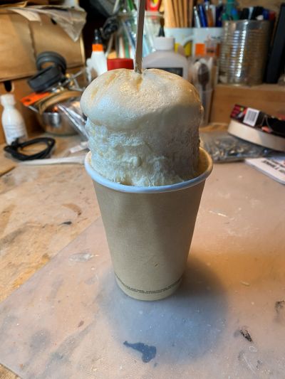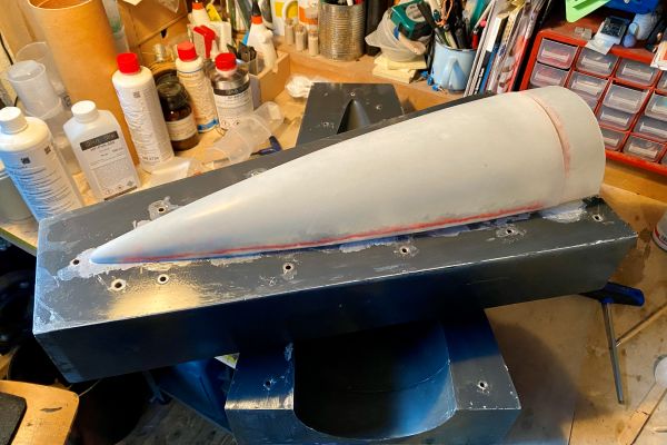 Der erste Abzug sollte eigentlich nur ein Versuch werden, um wieder in die Thematik "Laminieren" reinzukommen, und um einen geeigneten Laminataufbau zu finden. Die Form hab ich gereinigt und dann mit Füssigtrennmittel auf Wachsbasis vorbehandelt. Nach dem Trocknen hab ich Wachspaste mit einem Lappen einmassiert und nach dem Ablüften mit einem Wolllappen poliert. Danach hab ich mit einem Schaumpinsel wasserlösliches Folientrennmittel verstrichen. Mit der Vorbehandlung habe ich bislang die besten Erfahrungen gemacht. Gut zu sehen, wie riesig alleine schon die Form für die Spitze ist. Harz mit 55Minuten Topfzeit erlaubt es aber ganz entspannt beide Hälften zu präparieren und zu montieren. Für die Nahtstellen und die Kante zum Kuppler habe ich etwas Harz mit reichlich Glasballon angedickt und die entsprechenden Stellen mit dieser Pampe vorgelegt. Nach dem zusammensetzen wird das jeweils einseitig überstehende Gewebe mit der gegenüberliegenden Hälfte verstrichen und angedrückt, dabei drückt sich die Glasballonmatsche schön in den Nahtbereich und minimiert die Bildung von Fehlstellen. Die zusammengesetzten Hälften haben dann die Nacht vor dem Ofen im Wohnzimmer verbracht. Der erste Abzug hat mit Laminatstärke und Stabilität gleich bestanden und wird weiter verwendet. Da der fertige Apparat eh von der Grundfarbe her weiß wird, habe ich das Harz mit Farbpaste weiß eingefärbt. Aufbau ist (von außen nach innen) 1x166g/qm, 1x213g/qm und innen 1x320g/qm BD. Die Bindung der beiden Außenlagen ist "Köper", lässt sich immer viel besser in die Form legen als "Leinwand" Die dicke Innenlage in 320g/qm ist ein bidiagonales Gelege 45°/45°. Damit wird alles extrem stabil und die innere Oberfläche ist derbe rauh und bietet später allerbesten Halt um Spanten oder Trimmgewicht etc. einzukleben. Der Kuppler wird noch entfernt, hab den aber mitlaminiert, um eine schöne präzise Schulter und damit spätere Kante zu haben. Ohne den Kuppler wiegt die Spitze 275g. Ging doch. Geändert von Kabelmann am 06. Dezember 2025 um 17:45 |