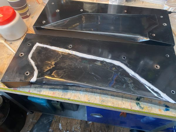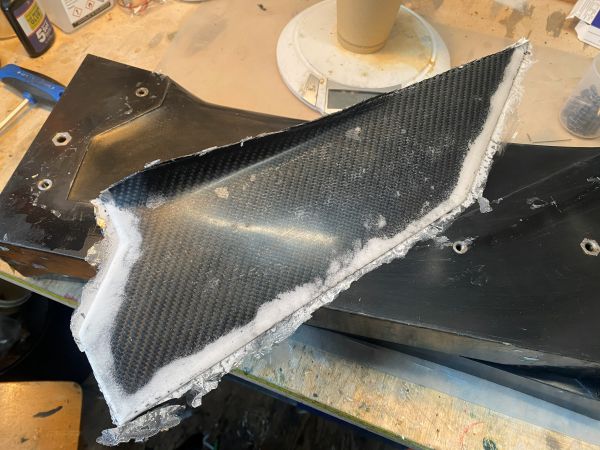 Ich war doch positiv überrascht. Auch hier war es dann nicht notwendig einen oder mehrere Versuchsabzüge zu machen, die Finnen sind mit dem ausgewählten Laminataufbau ziemlich genau so geworden wie angedacht. Die Raupe aus Glasballonmatsche hat dafür gesorgt, das die Kanten ziemlich gut und fehlerfrei aus der Form kommen, auch bildet sie innen einen etwa 10mm breiten umlaufenden Klebesaum, der beide Hälften einwandfrei miteinander verbindet. Aus optischen Gründen hätte man die Pampe auch mit schwarzer Farbpaste einfärben können, aber aus Gründen der Sichtbarkeit und um den Verlauf nachzuvollziehen hab ichs mir geschenkt. Kein Sichtcarbon, der Apparat wird eh weiß lackiert. Wandstärke ist echt dünn und eine gesäuberte Fine wiegt exakt 100g. Die Carbonmatte war hier goldrichtig. Die fertige Finne ist in Längsrichtung auch durch den Klebesaum extrem steif, durch die Verklebung und Fillets an der Wurzel, dort wo sie auf dem Körperrohr sitzen wird, wird das noch verstärkt werden, allerdings ist die Finne ein Hohlkörper und lässt sich dann auf der Fläche immer noch ziemlich eindrücken. Ziemlich leicht sogar. Optimal wäre es diesen Hohlkörper zu füllen oder durch einen eingeklebten Spant diese Flexibilität zu beseitigen. 2K-PUR Schaum zum Gießen ist ja nun für Privatpersonen nicht mehr ganz so einfach zu bekommen, eine Bestellung über die Einkaufsabteilung unserer Firma wäre möglich, aber, ich hab da noch eine nicht angebrochene, original verpackte, allerdings völlig überlagerte Arbeitspackung im Regal stehen. Nach zehn Jahren über Verfallsdatum sind Harz und Härter klumpig auskristallisiert, aber auf dem Beipackzettel stand, das lässt sich durch erhitzen im Wasserbad auf 70° wieder verflüssigen. Der erste Versuch zum Ermitteln der benötigten Menge lieferte auf jeden Fall ein gewohntes und gewünschtes brauchbares Ergebnis, auch wenn das Zeug jetzt eher so 3-4Minuten anstatt 2 Minuten zum ausreagieren und hart werden braucht. So stand dem weiteren Vorgehen nichts mehr im Wege, die Finnen werden ausgeschäumt. Dazu hab ich die Finne nach Begutachtung wieder in die Form gesperrt um ein Verformen durch den quellenden Schaum zu verhindern. Eine fertig ausgeschäumte, gesäuberte, bocksteife Finne wiegt dann zwischen 125 und 130 Gramm pro Stück. Da lässt sich doch mit Arbeiten. Auf jeden Fall. Um nochmal auf die störrische, weil schiebefest vorbehandelte Carbonmatte zurückzukommen: Leider ließen sich trotz der Sandsäcke zum Andrücken, zwei, drei Fehlstellen immer an derselben Stelle und immer in derselben Größe nicht vermeiden. Als strukturell unkritisch befunden wird das später mit Glasmatsche verspachtelt, das wird hier kein Sichtcarbon. Und wenn das Rohr später auch zig Macken aufweist, kann ich das ganze hinterher immer noch als Probeabzug unter dem Deckmantel von Forschung und Lehre deklarieren und nochmal und besser machen. Soweit Jan Geändert von Kabelmann am 07. Dezember 2025 um 13:21 |