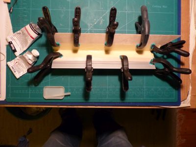 Als besondere Herausforderung erwies sich wie erwartet das Zusammenkleben der Finnen. Ich hatte zunächst die (Schnaps-)Idee, das mit Klötzchen zur Verstärkung zu machen. Aber das 0,8 mm starke Sperrholz ist doch sehr gewellt und das geriet zu einer Katastrophe: Also alles nochmal neu! Meine Überlegung war dann: Wenn die einzelnen Teile maßhaltig sind, reicht ein rechter Winkel und relativ genaue Abstände, um ein Quader zusammenzukleben. Gewölbte Flächen sollte das dann ausgleichen. Als rechter Winkel diente ein Aluprofil: Das Ergebnis sieht dann schon besser aus:  %Bild3 Gruß Achim]