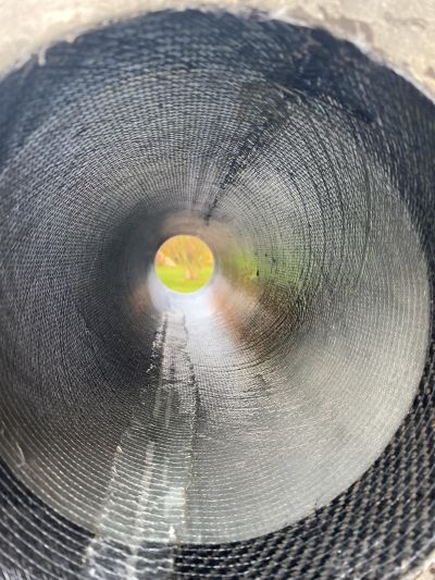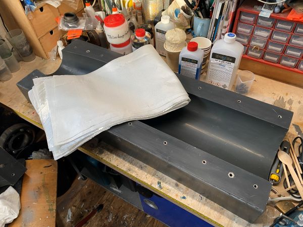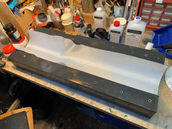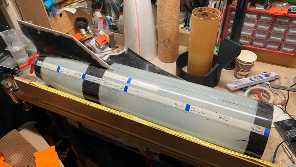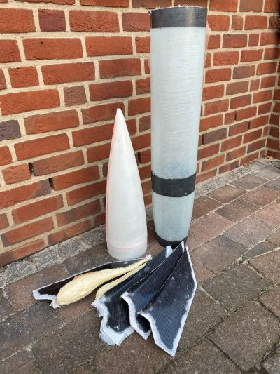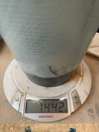 Mit 85cm Länge und 55cm Umfang geht da auf jeden Fall richtig was rein Form hab ich wie weiter oben beschrieben mit Wachs und Folientrennmittel vorbehandelt, die Finnen und die Spitze habe ich noch mit dem Pinsel getränkt und getupft, hier habe ich schmale Lackierrollen/Schaumstoffrollen benutzt. Harz hab ich in mehreren Portionen angemischt und habe bei offener Tür in der kalten Werkstatt gearbeitet, um um jeden Preis zu verhindern, das das Harz vorzeitig anzieht. So ließ sich mit 55Minuten Topfzeit ohne Hektik arbeiten. Laminataufbau (von aussen nach innen) 166g/qm, 213g/qm und 320g/qm Innen wieder das grobe 45°/45°, bidiagonale Gelege, welches relativ viel Harz bindet und das ganze ziemlich stabil macht. Beim Zuschnitt bin ich etwas knauserig gewesen, da wären 10-15mm mehr Breite schöner gewesen und hätten zuverlässig überlappt, so ist da noch ein Streifen Gelege eingelegt worden um den stumpfen Stoß zu überbrücken und Fehlstellen zu verhindern. An den Rändern und im Bereich der Finnen habe ich Carbonstreifen zur Verstärkung mit eingelegt. Die ganze Fuhre hat wieder in der Küche auf der Fußbodenheizung übernachtet. Nach dem Ausschalen wieder das Wiegen: Das Rohr hat 635g, und zusammen wiegen Finnen, Spitze und Körperrohr 1440g. |