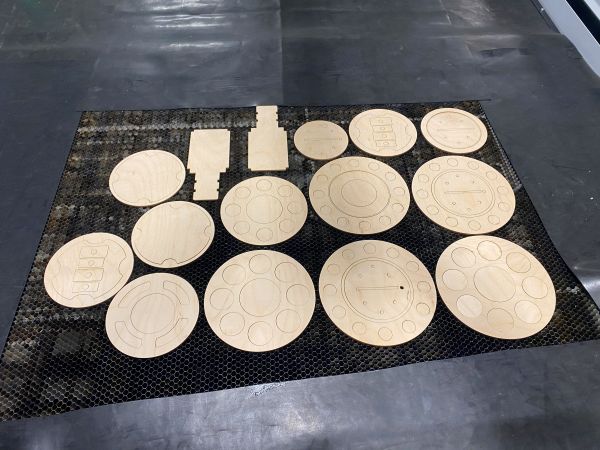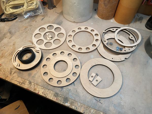 Mittlerweile ist auch das bestellte 4" Phenolrohr und Kupplerrohr eingetroffen und ich hab mir mal Gedanken über die Längen von Motorrohr, Innenrohr und Kupplerrohr gemacht. Genauso wie über Anordnung und Ausführung der Spanten und Zentrierringe. Nachdem Durchmesser und Funktion feststand, hab ich diese gezeichnet und dabei gleich noch die E-Bay einer anderen Baustelle mitkonstruiert. Birkensperrholz in 4mm und Birkenmultiplex in 6mm ist besorgt, jetzt brauche ich Zeit und Gelegenheit, um die auf einer unserer Lasermaschinen auszuschneiden. |