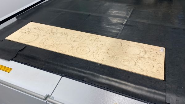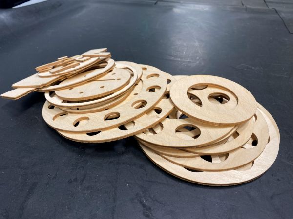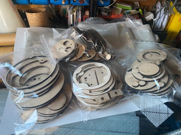 Am Freitag den freien Tag genutzt und auf einer unserer Maschinen Zentrierringe und Spanten aus 4mm Birkensperrholz und 6mm Birkenmultiplex geschnitten. Zentrierringe um das 54mm Motorrohr und das 4" Innenrohr im Körperrohr zu fixieren habe ich aus 4mm Birkensperrholz geschnitten Video 4mm Birkensperrholz 650W CO² Laser Alle Zentrierringe sind mit großen Löchern versehen um noch mehr Gewicht zu sparen Bei der Gelegenheit habe ich auch noch 6mm E-Bay Deckel für die A4 und für zwei andere Baustellen geschnitten. Video 6mm Multiplex 650W CO² Laser Alles was der reinen Zentrierung dient ist in 4mm Sperrholz ausgeführt. Alles was darüber hinaus in irgendeiner Form noch strukturelle Aufgaben hat wie der Schubspant, die Abschlußspanten zwischen Körperrohr und Spitze, sowie der Spant der das 54er Motorrohr mit dem 100er Innenrohr verbindet und gleichzeitig als Aufhängepunkt für die Schockleine dient, sind aus 6mm Multiplex geschnitten. Der Schubspant (links) hat noch zwei Zierringe bekommen, um seitlich mehr Klebefläche zu generieren. Der Mittelspant hat noch eine Aufdopplung aus einem 4mm Innenringbekommen um das 100er Rohr besser zu positionieren. Ausserdem hab ich so 10mm "Fleisch" für die Befestigung der Schockleine. Der Spant für die Spitze hat noch einen Positionierring mit einer Nase bekommen, um das Kupplerrohr mit der Elektronik Bay einsetzen und befestigen zu können Die A4 Spanten zusammen wiegen um 340g und haben aktuell einen Anstrich aus Epoxydharz bekommen, wenn die dann trocken sind, gehts weiter. Bis dahin muss ich eine Möglichkeit finden die PML Phenolrohre sauber und winklig zuzuschneiden. Geändert von Kabelmann am 14. Dezember 2025 um 20:52 |