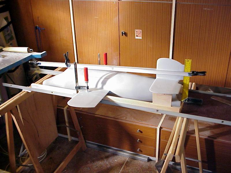 Zuvor habe ich mir ein gerades und paralleles Gestell aus Winkeleisen und Leisten gebaut wo die Bachem Natter an den Flügeln angeklemmt wurde.